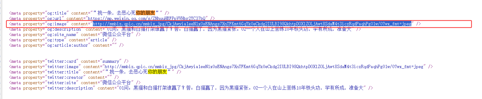 3、搜索图片链接:按 Ctrl+F 搜索 “var msg_cdn_url” 或 “og:image”,找到对应链接。(或者也可以直接搜索文章的标题,也可以找到这个位置)