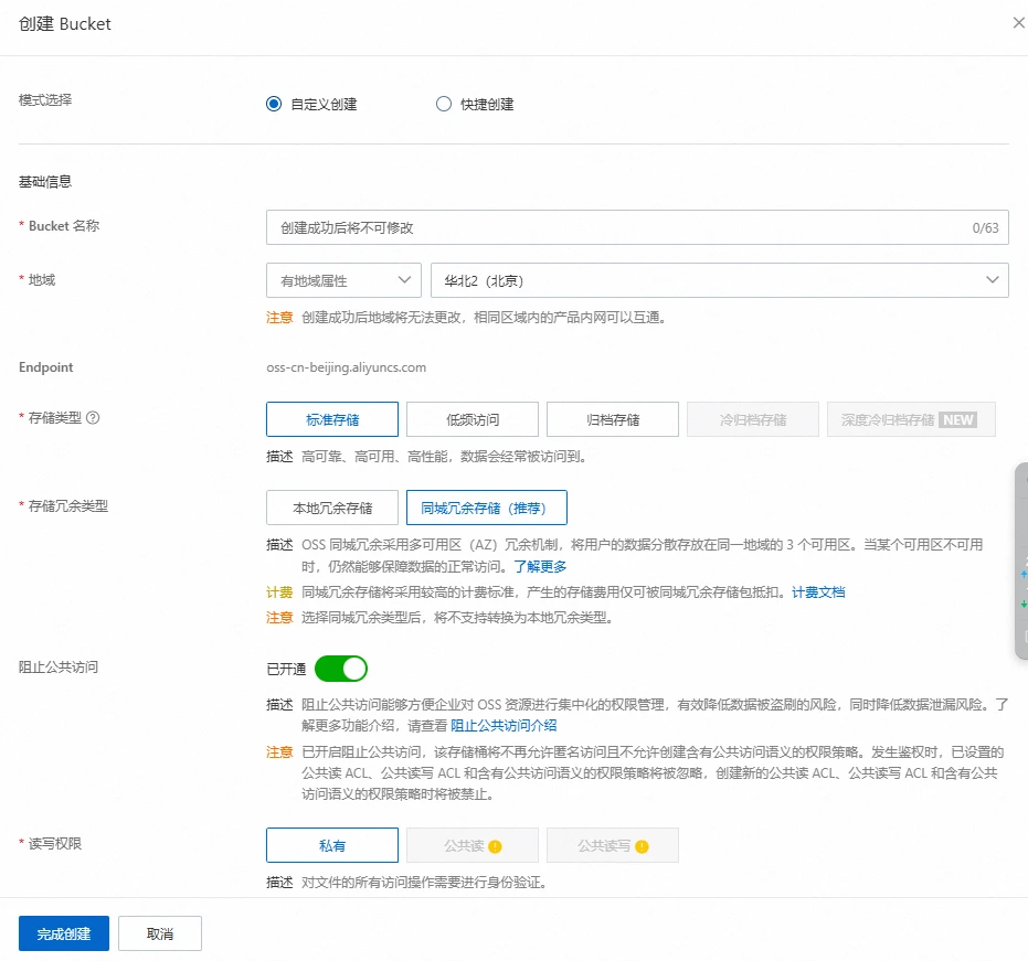 2、创建bucket,也叫做桶,用来装你的备份数据,权限设置为私有。不会设置的快捷创建就可以