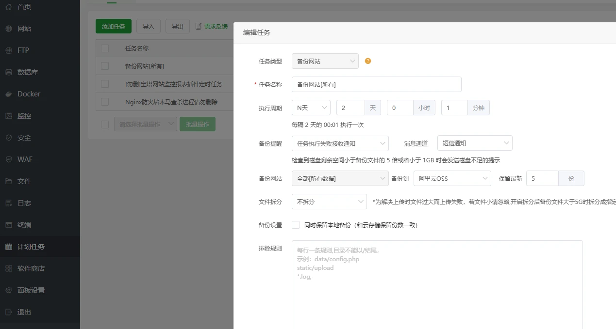 6、在宝塔面板左侧的“计划任务”-选择备份网站和数据库-选择备份到阿里云OSS。