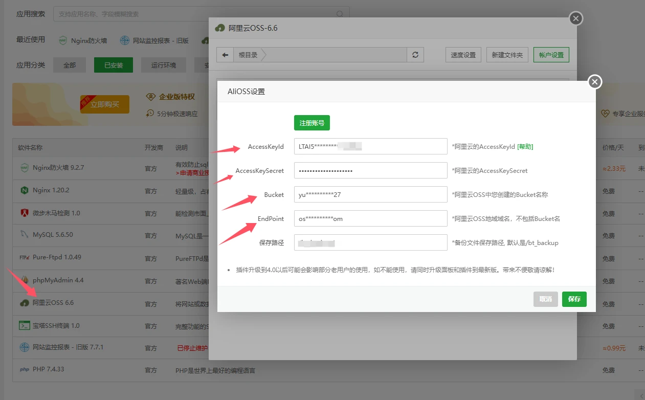 3、在宝塔面板后台安装阿里云OSS,填写相关信息