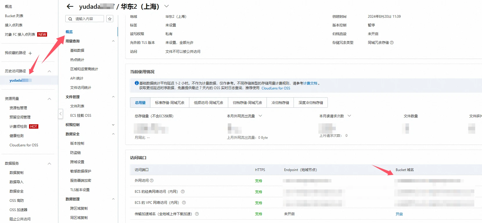 点击左侧Bucket列表,点击你想要查看Endpoint的Bucket名称,进入该Bucket的详情页面