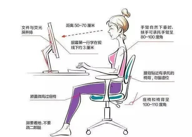 在电脑前正确的坐姿为,上半身应保持颈部直立,使头部获得支撑,两肩自然下垂,上臂贴近身体,手肘弯曲呈90度,操作键盘或滑鼠,尽量使手腕保持水平姿势,手掌中线与前臂中线 应保持一直线。下半身腰部挺直,膝盖自然弯曲呈90度,并维持双脚着地的坐姿。